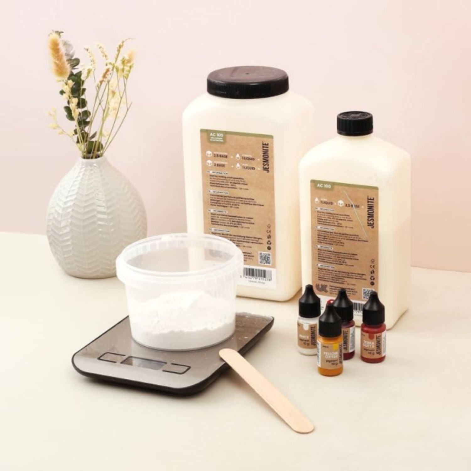 Beim Anmischen der Jesmonite-Giessmasse ist das korrekte Mischverhältnis wichtig, weil es Einfluss auf Fliesseigenschaft, Festigkeit und Aushärtung hat. Für Jesmonite AC100 ist das Standard-Verhältnis ca. 2,5 Teile Basispulver zu 1 Teil Flüssigkeit (nach Gewicht) – also z. B. 250 g Pulver auf 100 g Flüssigkeit.