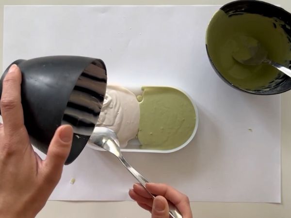 Giesse die angemischte Jesmonite-Giessmasse langsam und gleichmässig in die vorbereiteten, sauberen und trockenen Silikonformen und klopfe zwischendurch vorsichtig auf die Form, damit eingeschlossene Luftblasen aufsteigen und entweichen – so bekommst du glattere Oberflächen im Endergebnis